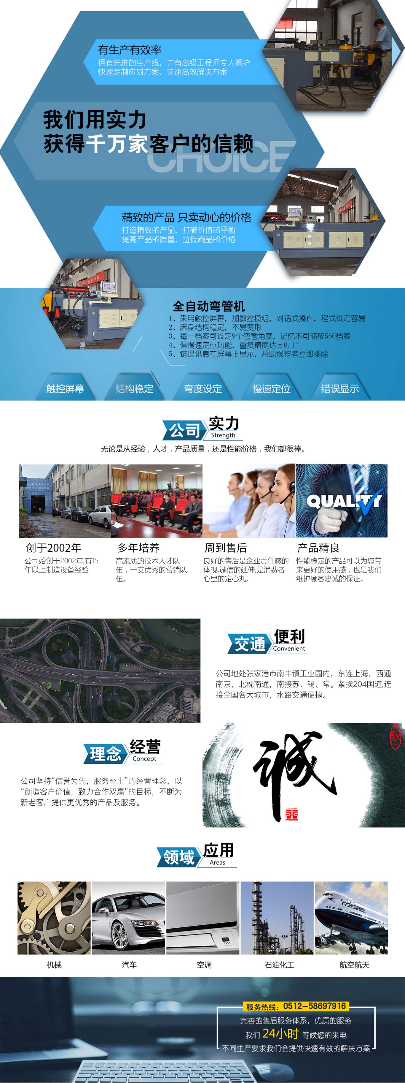 張家港市雙和機(jī)械制造有限公司始建于2001年,占地面積12000平方米,南鄰蘇州、無錫、上海,東鄰常州、南京,交通便利,位長三角中間地段,風(fēng)景優(yōu)美的張家港。 雙和公司至創(chuàng)立開始,引進(jìn)了國外的設(shè)計(jì)制造理念,組建了企業(yè)生產(chǎn)管理優(yōu)秀團(tuán)隊(duì),致力于管材加工機(jī)械研發(fā)、設(shè)計(jì)、制造。創(chuàng)新的設(shè)計(jì)理念,嚴(yán)格的質(zhì)量把關(guān),專業(yè)的售后服務(wù),不斷提升了我在整個(gè)行業(yè)的影響力。 雙和公司生產(chǎn)的系列產(chǎn)品分為彎管機(jī)、切管機(jī)、縮管機(jī)、磨齒機(jī)、伺服彎管機(jī)、數(shù)控彎管機(jī)、液壓彎管機(jī)、自動切管機(jī)、管端成型機(jī)、倒角機(jī)、大弧滾圓機(jī)、鋁切機(jī)、壓彎機(jī)等管材加工機(jī)械,廣泛用于航天業(yè)、造船業(yè)、汽車制造、鍋爐制造、自行車、摩托車、體育健身器材、管制品家...
